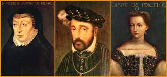 "In the interior of the palace a greater influence ruled, that of Diana, created in the following year Duchess of Valentinois, but now called 'la Grande Senechale,' being the widow of Louis de Breze, Grand Seneschal of Normandy, who had died in 1531. At the age of forty-eight, Diana had preserved her charms in a manner so remarkable as to be attributed by the vulgar to philtres and incantations. The ancient mistress of Francis pretended that her friendship for his son was merely Platonic, though it can hardly be doubted that she had had a daughter by Henry as early as 1537; and she still supplanted the youthful Queen, Catherine de' Medici, in his affections, who meekly followed the triumphant chariot of her rival. (1521-1598: 175)